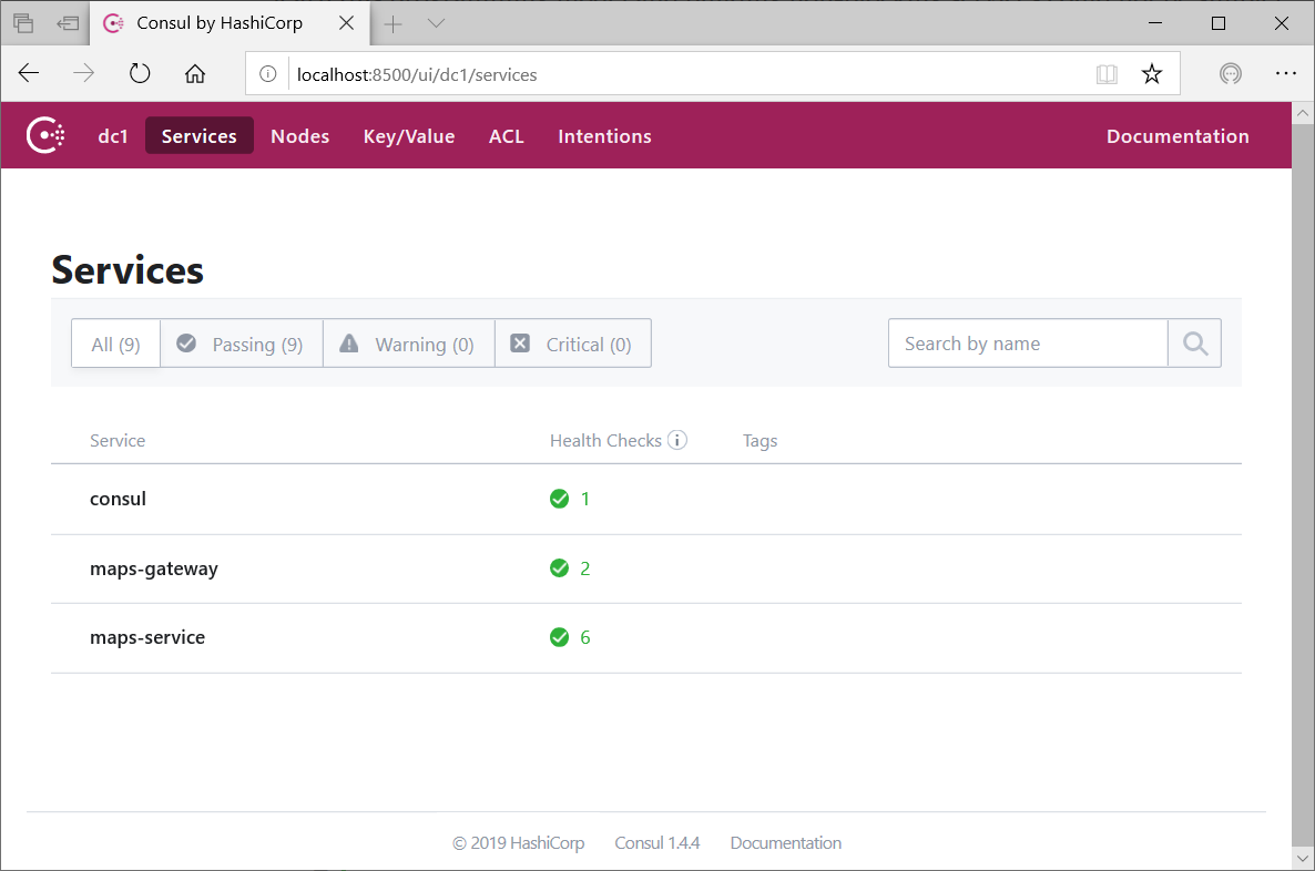 Looking at Consul web interface, should list all your services (1 gateway and 3 services).